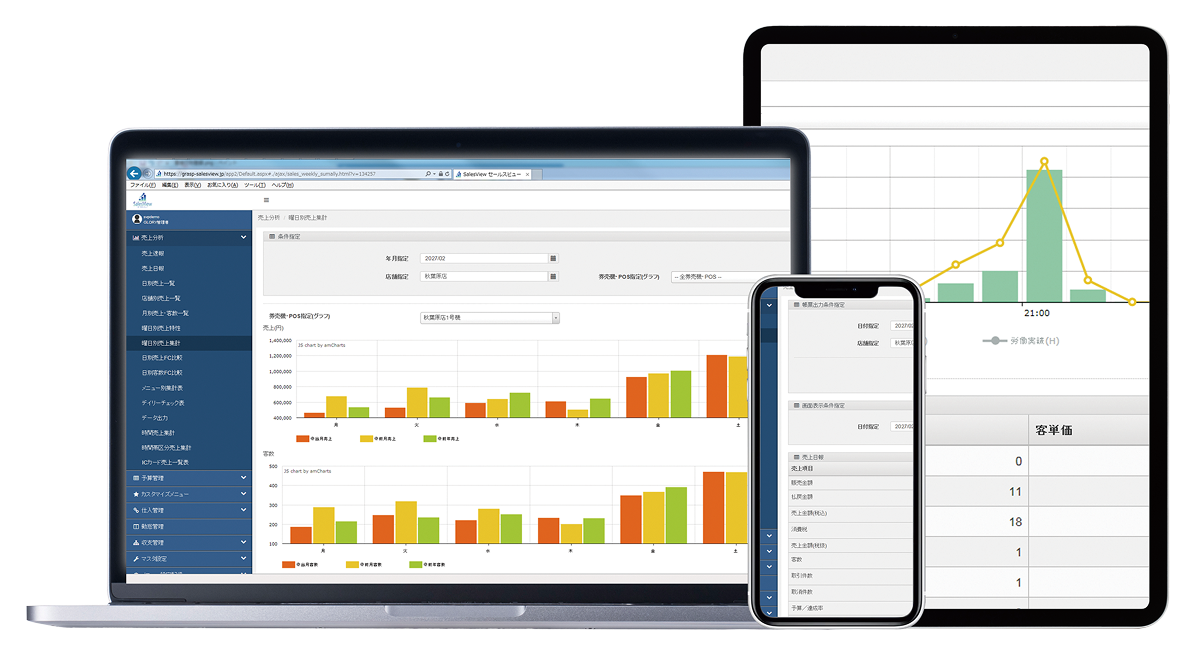 インターネットにつながる環境なら、ご自宅はもちろん、外出先や旅先からでも簡単にご利用できます。パソコンはもちろん、スマートフォンやタブレットで店舗の売上状況、従業員の勤怠情報など、さまざまな情報を「見える化」します。