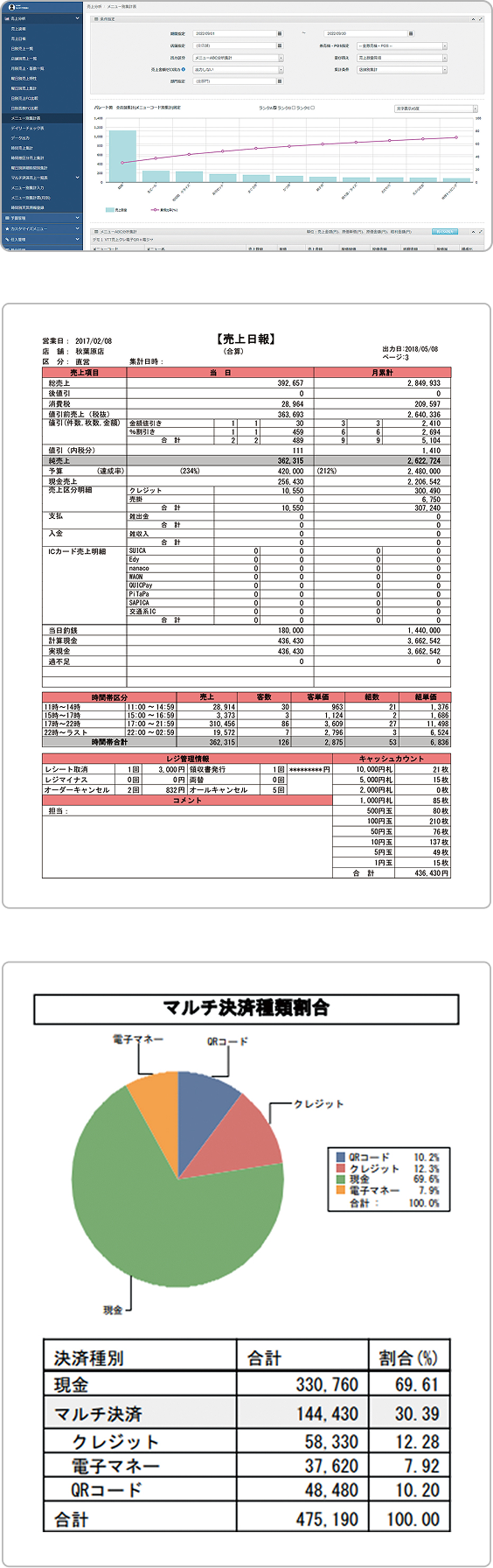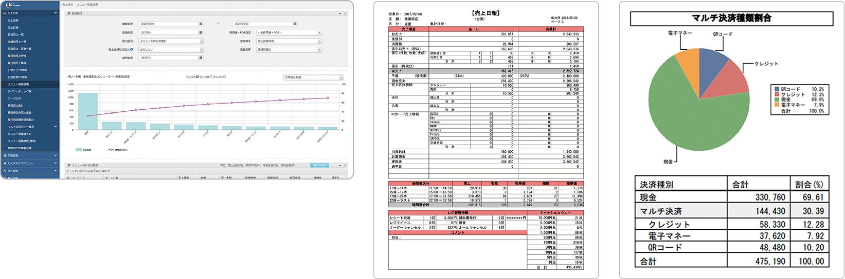 日付指定範囲のメニュー別売上集計を売上の多い順に出力します。 出力条件を選択することにより、メニュー別ABC分析集計、 メニュー別時間帯別集計など、さまざまな分析角度から売上を把握できます。 また、PDFファイル、CSVファイルに出力する事が可能です。