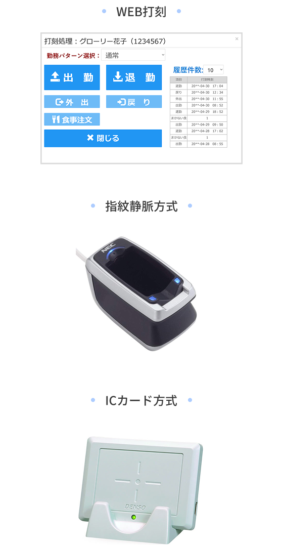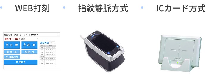 指紋静脈方式、ICカード方式、WEB打刻方式を使用して出退勤の登録を行います。