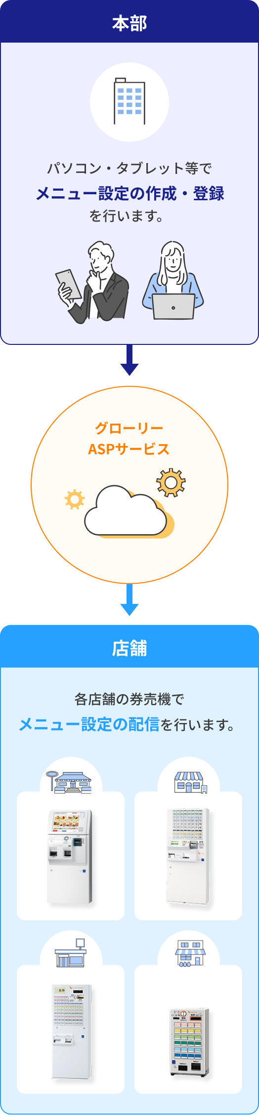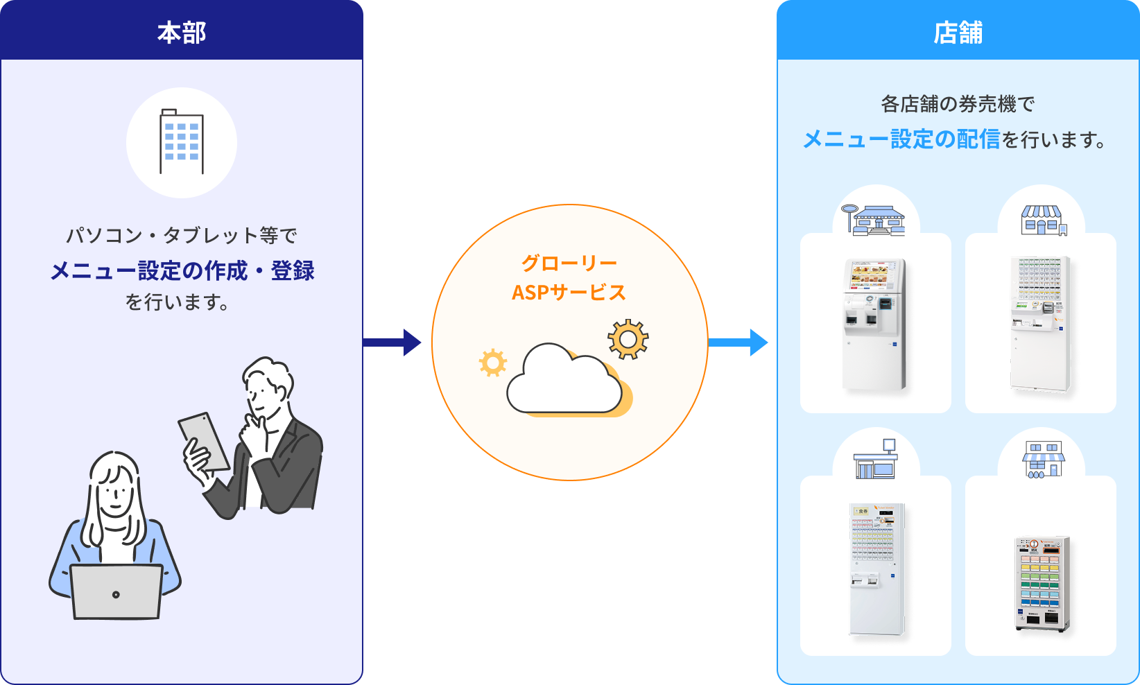 お客様にて作成いただいた “メニュー設定ファイル” を、「SalesView」にアップロードしていただくことで、ご指定の日時に、ネットワークを通じて各券売機へ配信いたします。